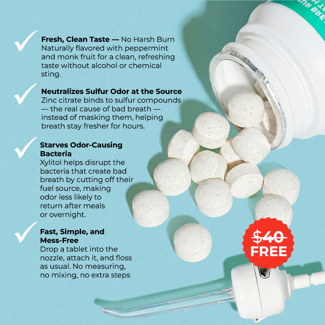 • 1x FREE Puur Breath Fresh Tablets - Drop one tablet into the custom nozzle and let your water flosser deliver zinc citrate and xylitol directly where bad breath starts — neutralizing odor at the source, not just masking it.