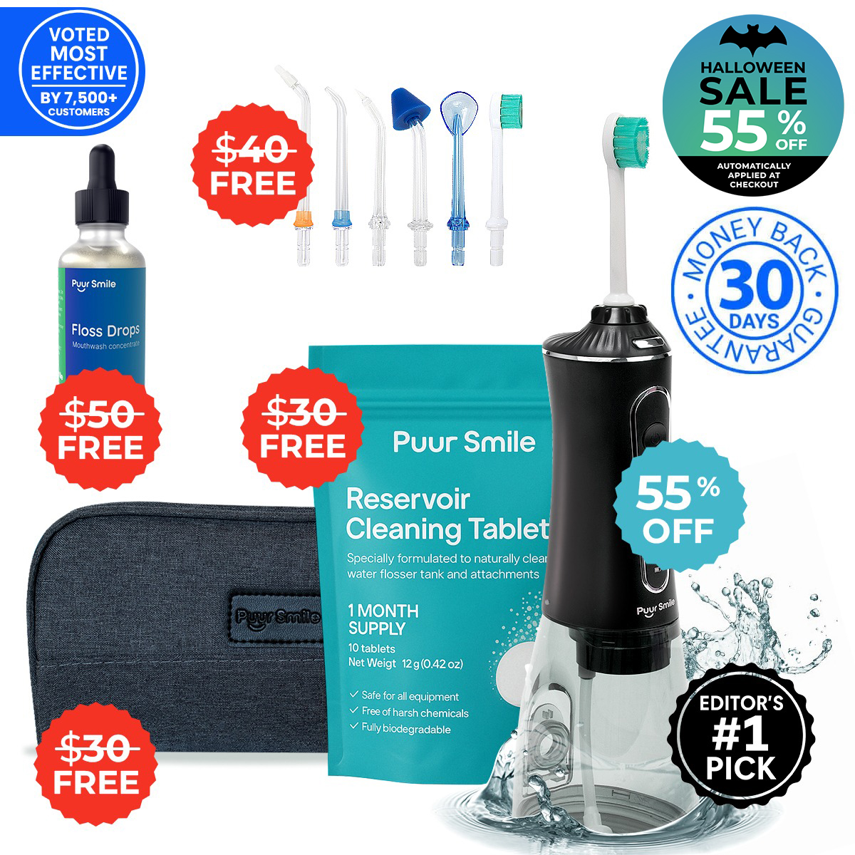 Of all 24 water flossers we tested, Puur Smile™ delivered the most dramatic results, especially for removing hard, stuck-on plaque and improving breath freshness. What makes it stand out? This sleek, handheld device packs 140 PSI of pressure, yet remains gentle enough for sensitive gums, crowns, and implants. In just 1–2 minutes per day, it blasts away the bacteria that brushing and flossing miss, even below the gumline, where most plaque and odor-causing buildup hides. Even better, it’s the only model that comes with FlossDrop™ Serum, a breakthrough bacteria-fighting formula that turns ordinary water into a minty, plaque-dissolving treatment. Puur Smile also scored highest for customization, convenience, and value making it the top recommendation for both adults and kids. And for a limited time, they’re offering up to 55% off plus $150 in free bonuses, available only through this page.