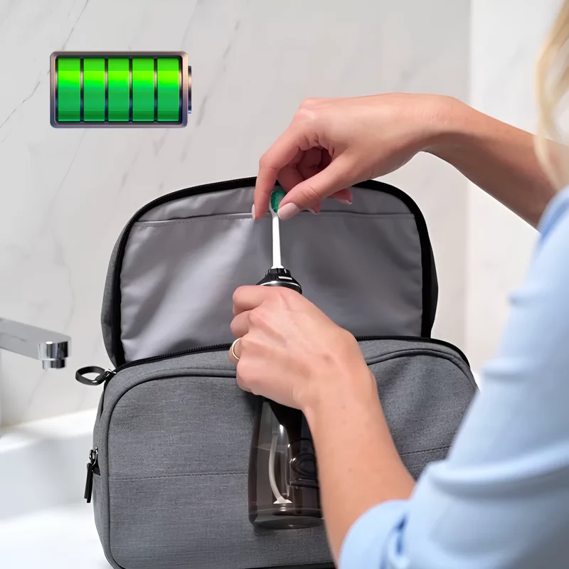 Organize your full oral-care kit in one sleek, waterproof bag. Perfect for home or travel.