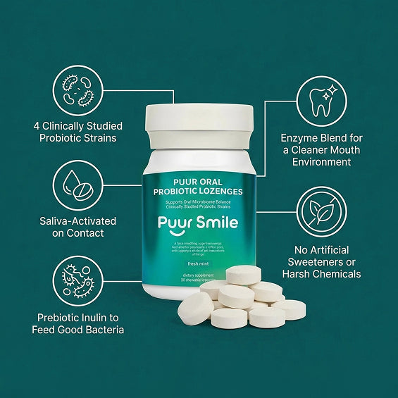 Puursmile is the oral probiotic lozenge designed for people who brush every day and still deal with bleeding gums, bad breath, or sensitive teeth.